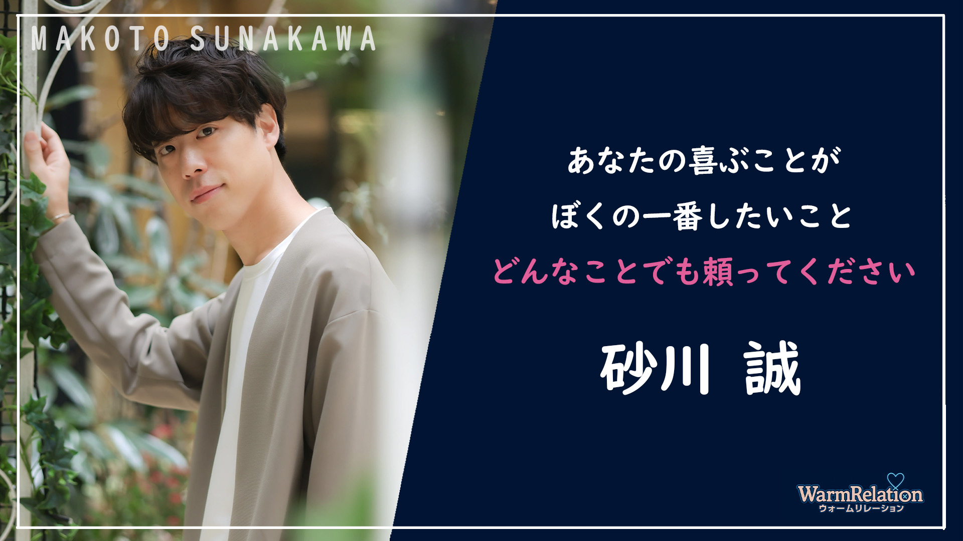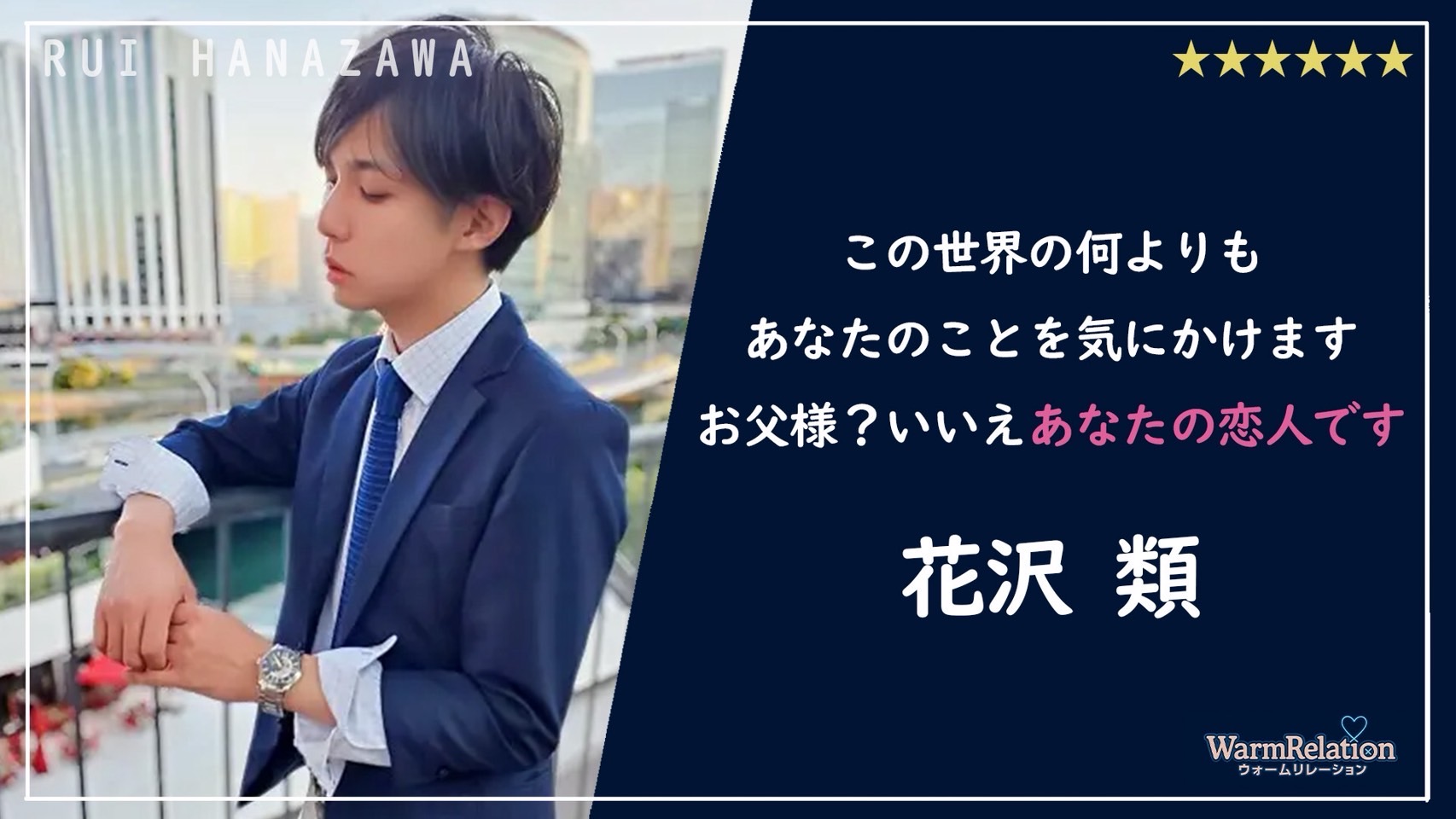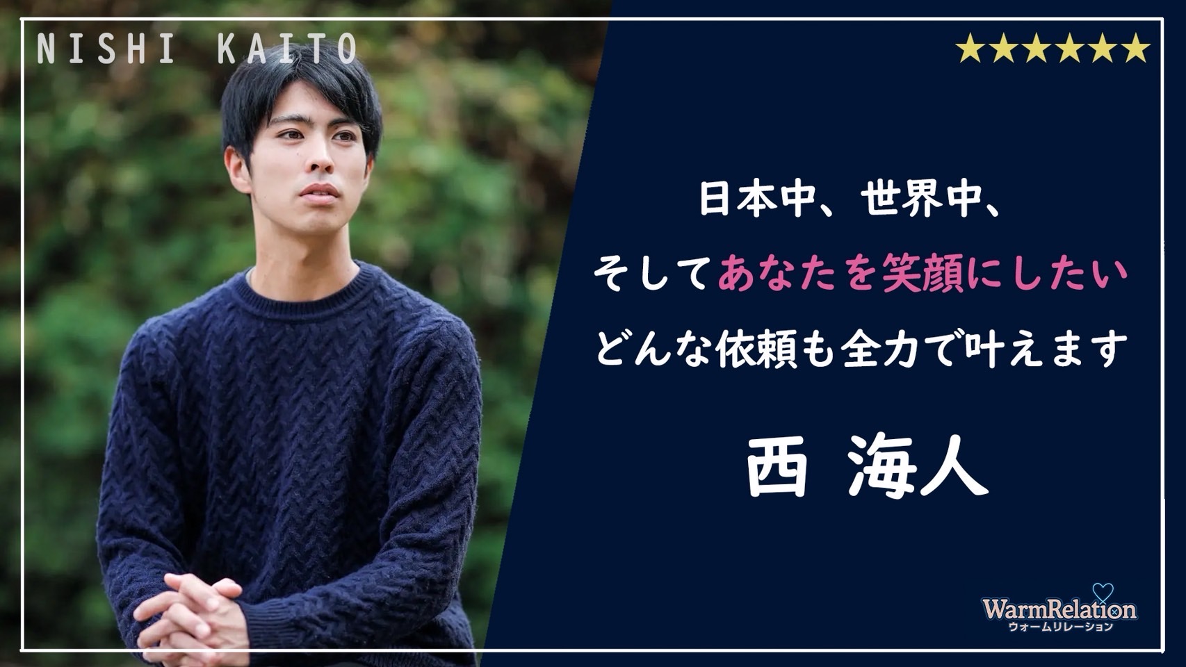 レンタル彼氏ウォームリレーションは、2013年オープン当初から「感動と成長」を理念に掲げ、老舗の安心感と抜群の信頼で全国No.1のレンタル彼氏サービスとして多くの皆様にご利用いただいております。