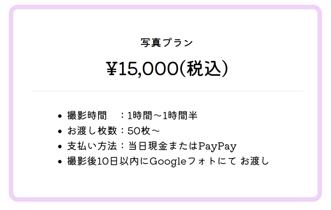 撮影時間は1時間目安で料金は交通費込み総額10,000円。