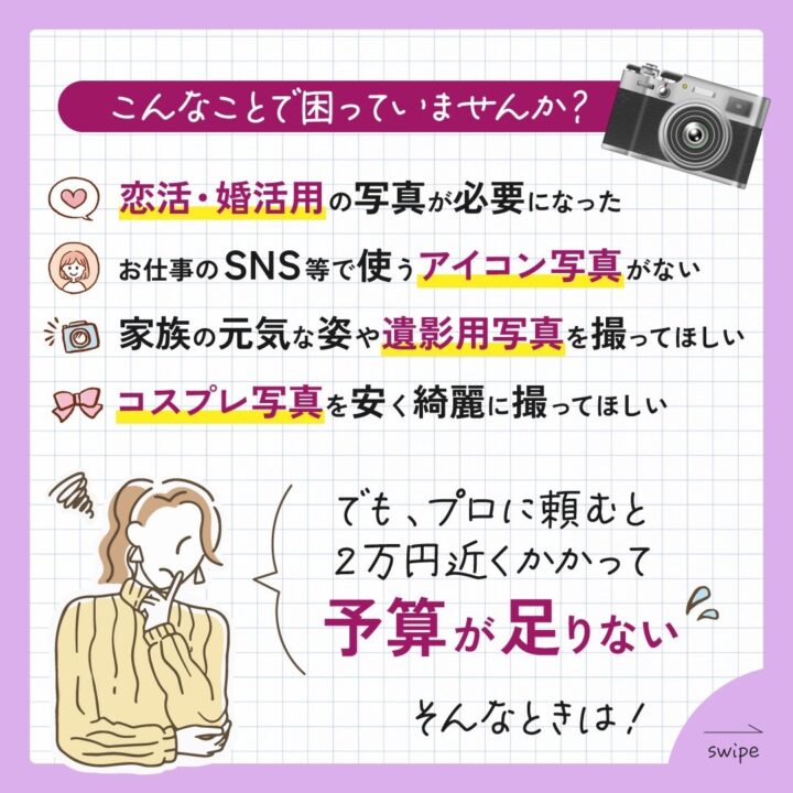 より時間のかかる本格的な撮影を行いたい場合は、通常料金にて承りますので気軽にお声がけ下さい。