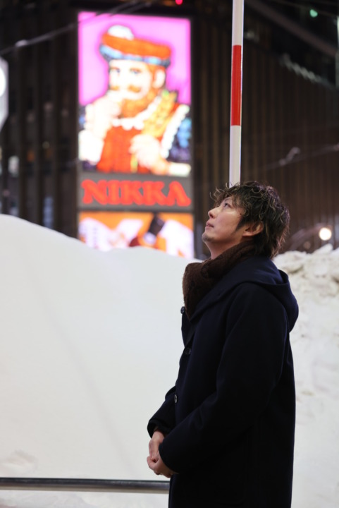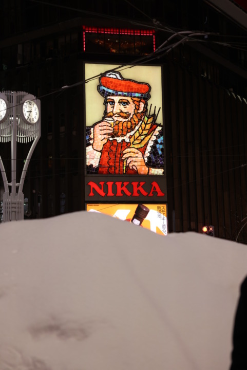 有名なニッカウヰスキーの看板(ニッカおじさん)の前でも撮影を行いました。