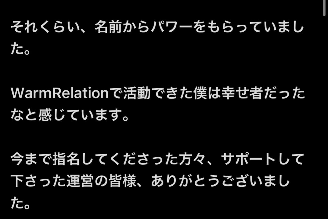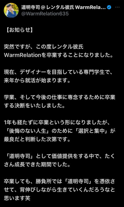 キャスト卒業のお知らせ キャスト卒業のお知らせです。 道明寺司さんがWarmRelationを退店することになりました。 これまでご利用してくださった皆様、どうもありがとうございました。 夢を叶え、またいつか復帰してくれる日を待っています。 この記事を書いた人 WarmRelation運営 記事一覧