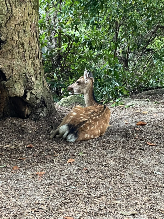 海も山もあって自然豊かな宮島!優雅にくつろいでいる鹿さんをもいた